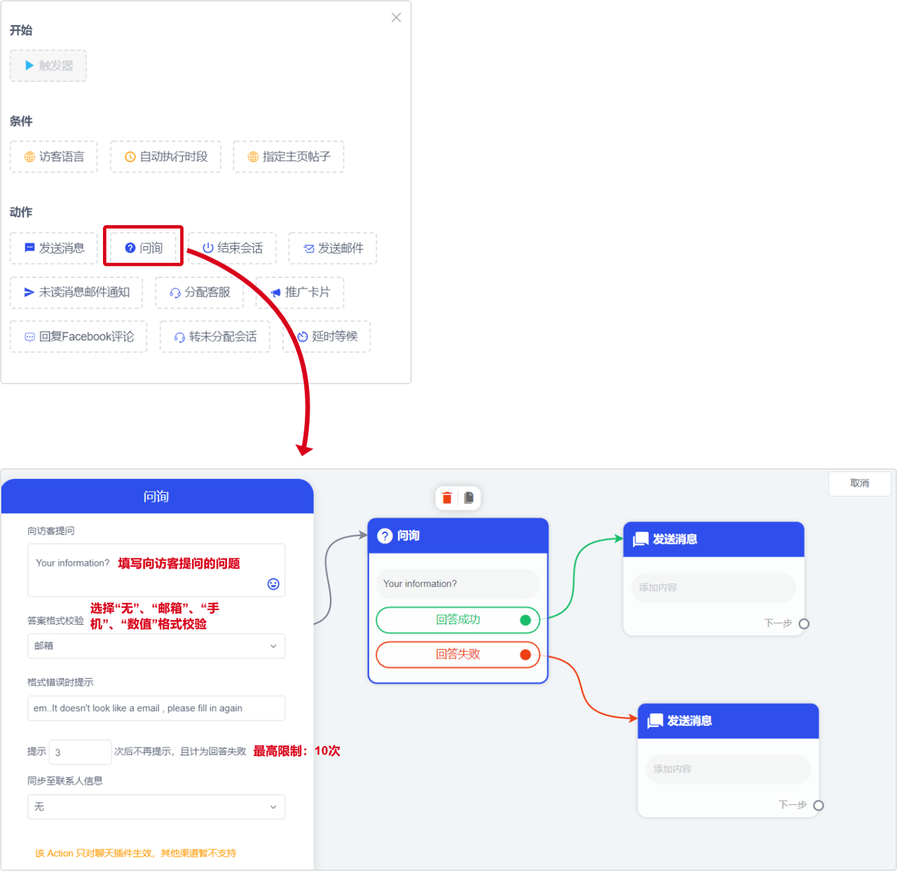 Usage scenario: You want to collect visitor information by asking them questions, such as asking a robot questions like "What is your email address?" or "Please send us your mobile phone number so that we can contact you later." Then you can use this Inquiry action. After the visitor sends the information, the information will be directly synchronized to the contact person.