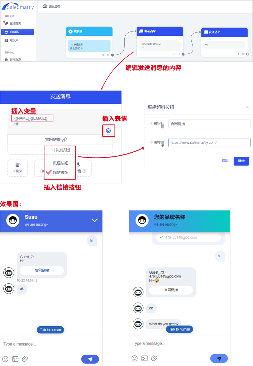 Now when setting up the automation - Send Message action, you can insert emoticons, hyperlink buttons, and insert variables. After inserting a hyperlink button, visitors will be redirected to the hyperlink you set when they click the button. Inserting variables means that you need to manually enter , when editing the message, and when visitors receive this message, they will see their own name or email address.