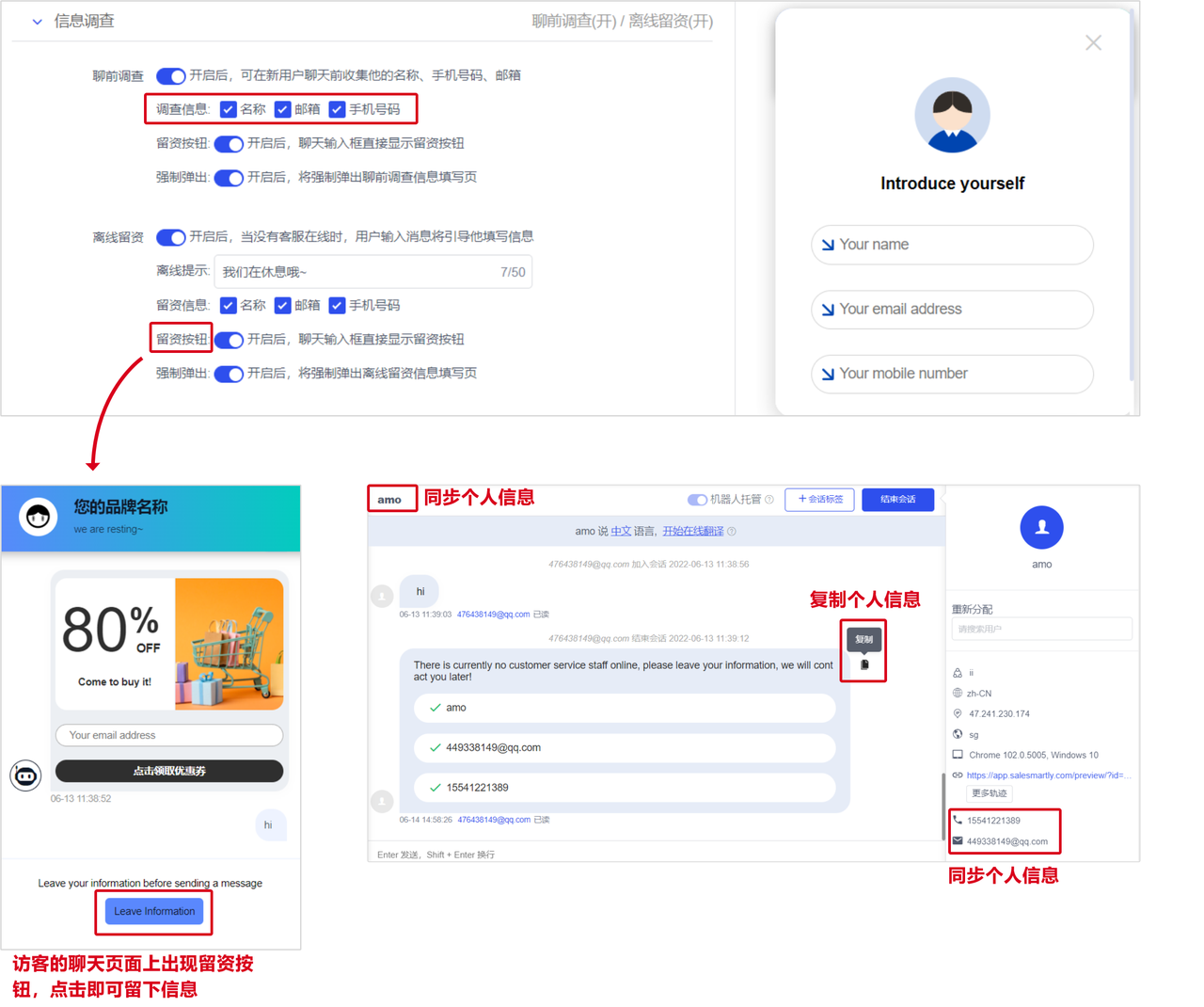 In Settings - Channels - Chat Plugins, find the chat plugin you want to set up, click "Edit Plugin" to enter the "Information Survey" section. In this section, select the type of information to collect from users and form a user information form. The user's information form can be viewed in the chat interface or session record, and it supports one-click copying of user information in the chat interface. At the same time, the display effect of the leave information button has been added. Visitors can click this button to fill in personal information.