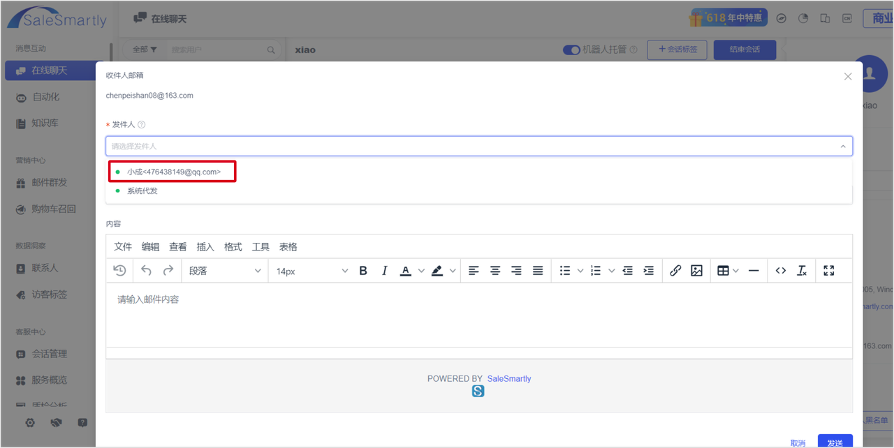 When replying to user messages via email in the chat interface, you can choose to have the system send the message, or you can use the email address you authorized to send the email directly to your customer.