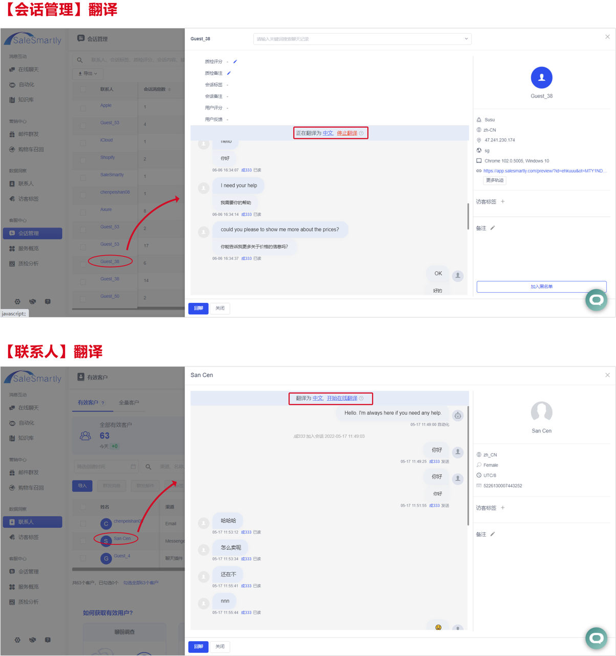 A translation function has been added to the Contacts Conversation Management module. When you view a conversation record, you can click Translate to translate the entire chat record, helping you understand the context and meaning of the conversation when reviewing or checking the conversation details.