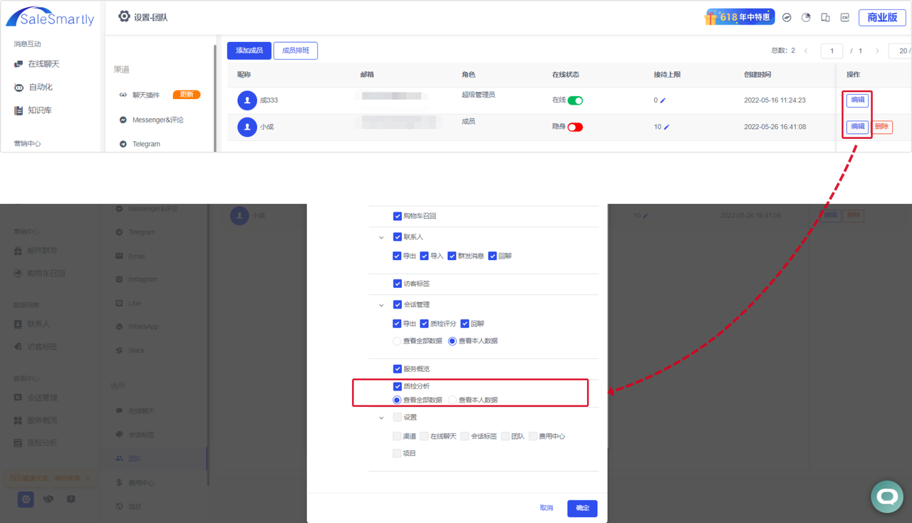 In Settings - Team - Edit Permissions, you can subdivide the quality inspection and analysis permissions of team members/managers and set them to "View all data" or "View my own data". If it is set to "View my own data", the member can only see the data belonging to him/her, and cannot view the data belonging to others. If it is set to "View all data", you can view the data of everyone, and you can also click to view the data of a certain member.