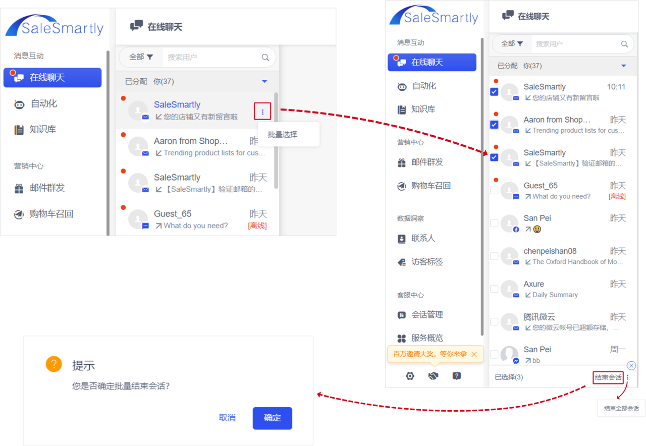 In Online Chat, click "Batch Selection", select the conversations you want to end in batches, then click "End Conversation", confirm the end of the conversation twice, and you can end the selected conversations in batches. Click "End All Conversations" to end all conversations.
