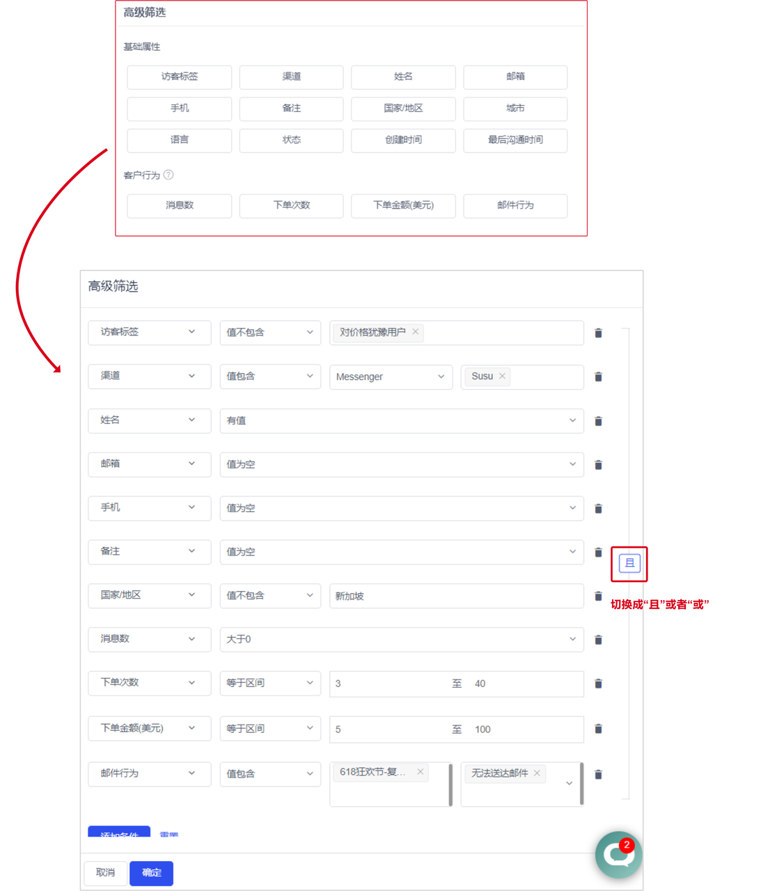 Usage scenario: If you want to find the target group under multiple conditions, such as users with a certain tag on Facebook channel and whose language is Chinese, you can use the advanced filtering function in Contacts or Bulk Email.
