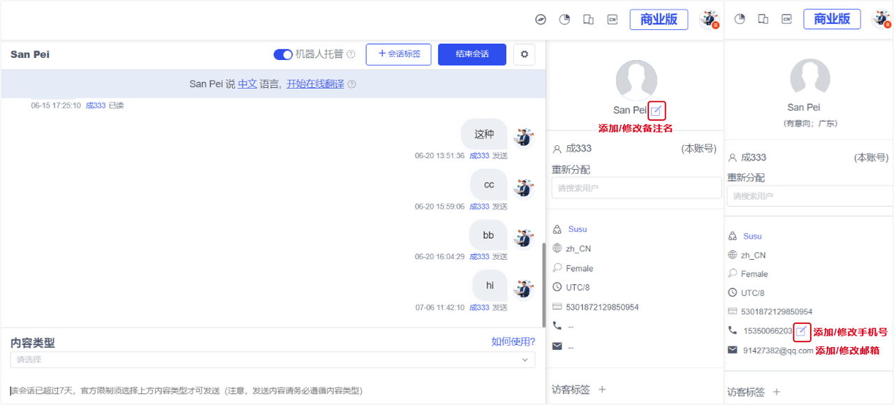 In Online Chat, in the chat interface with customers, the customer information column now supports adding notes to customers and manually adding/editing customer phone numbers and email addresses.