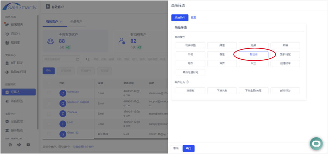The added or modified customer's note name, mobile phone number, and email address will be synchronized to Contacts and Conversation Management. In Contacts, you can filter by note name to find your target customers.