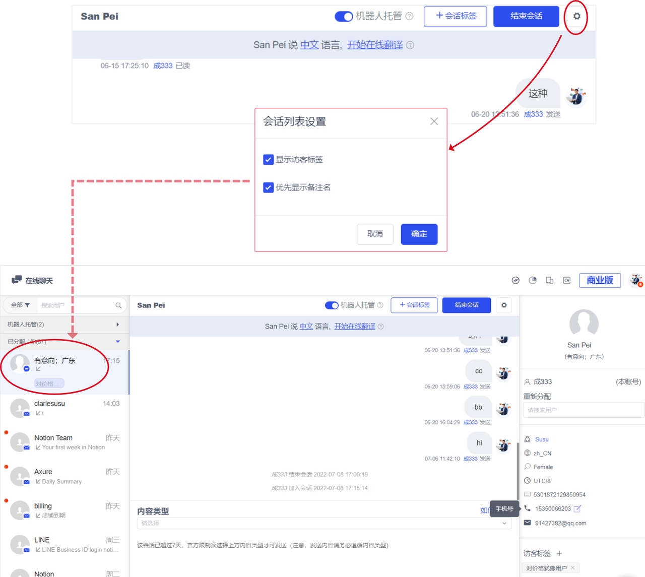 In the chat interface with customers, you can set whether to display the visitor label in the online chat list and whether to display the note name first. (Note: This conversation list setting is only valid for the current customer service account)