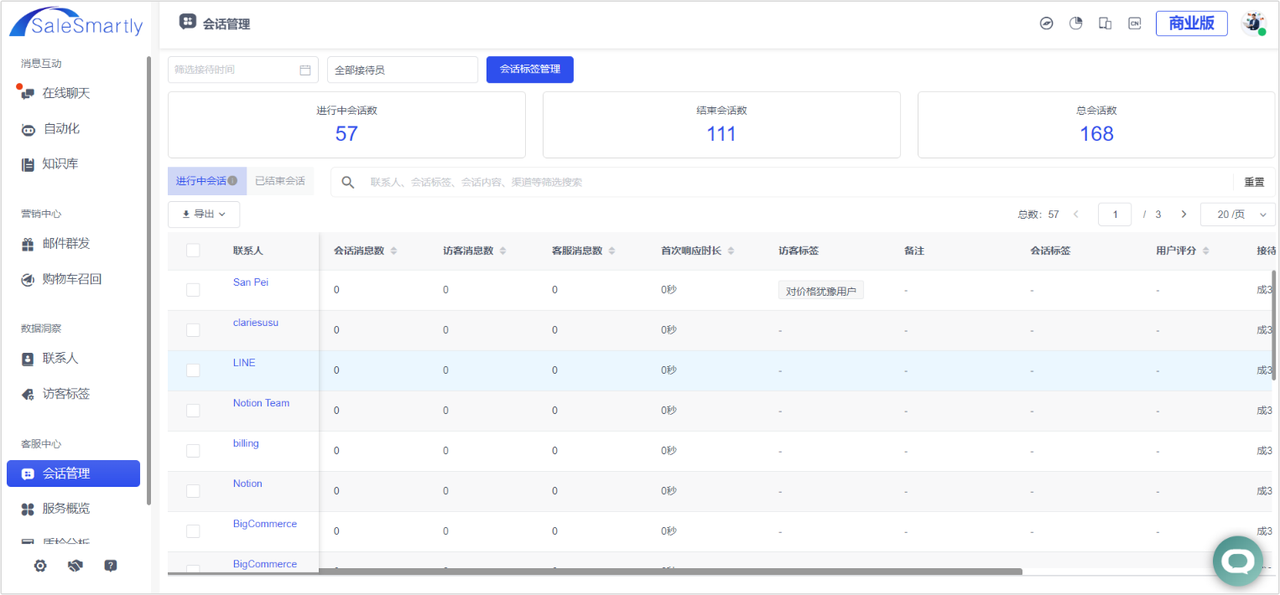 In Session Management, you can now view session records based on customer service reception time/receptionist. A data dashboard is also provided, allowing you to clearly see the "Number of ongoing sessions", "Number of ended sessions", and "Total number of sessions" under your project, and "Ongoing sessions" and "Ended sessions" modules are also provided. Ongoing sessions display the assigned session records, where the number of session messages, visitor messages, customer service messages, and first ring duration are updated every 1 hour.