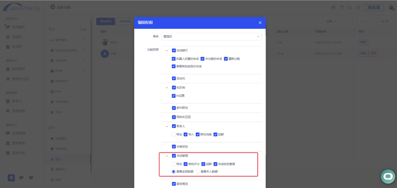 Usage scenario: If you only want project members to view the conversation records they have hosted, you can set View personal data in the permissions section, and you can also clearly see the ongoing and ended conversations.