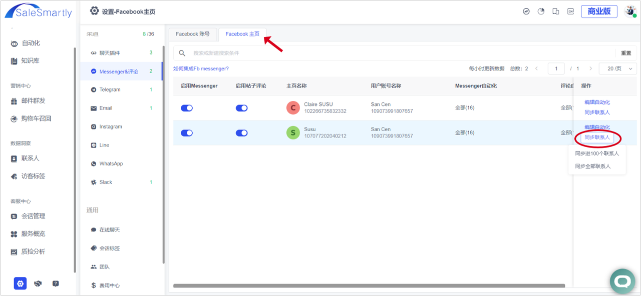 In Settings - Channels - Messenger & Comments, click "Facebook Homepage" and select the homepage you want to sync contacts with. Click "Sync Contacts" to sync "nearly 100 contacts" or "all contacts" in the homepage to SaleSmartly (contact information and nearly 20 chat records of each contact will be synced).