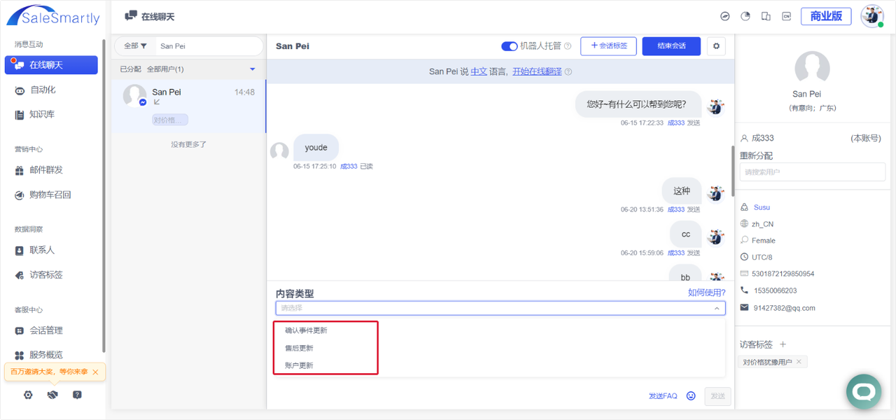 It now supports direct replies to visitor messenger messages within 7 days. After a conversation in Messenger exceeds 7 days, when customer service enters a message in the chat box, they need to select the content type related to the content to send it together, that is, select "Confirm event update/after-sales update/account update".