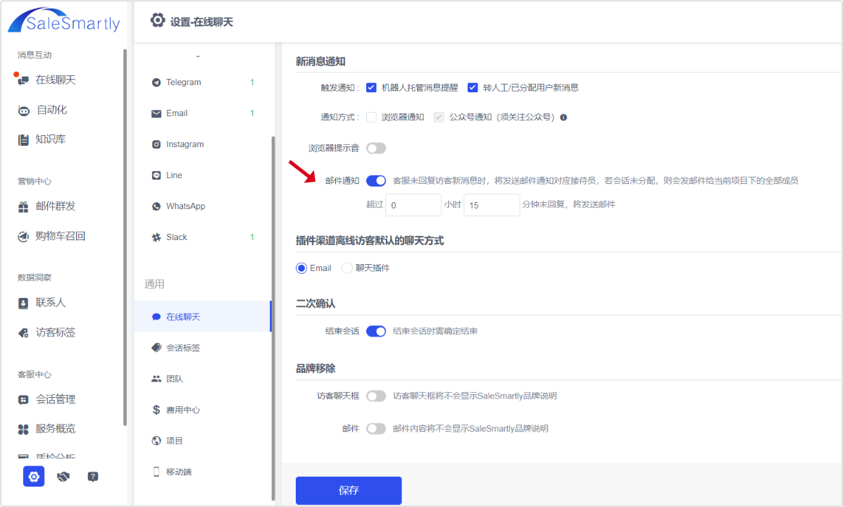 In Settings - Online Chat - New Message Notification, the Email Notification switch setting is now added. After it is turned on, if the customer service does not reply to the visitor's new message within the time you set, an email will be sent to notify the corresponding receptionist. If the session is in an unassigned state, an email will be sent to all members under the current project.