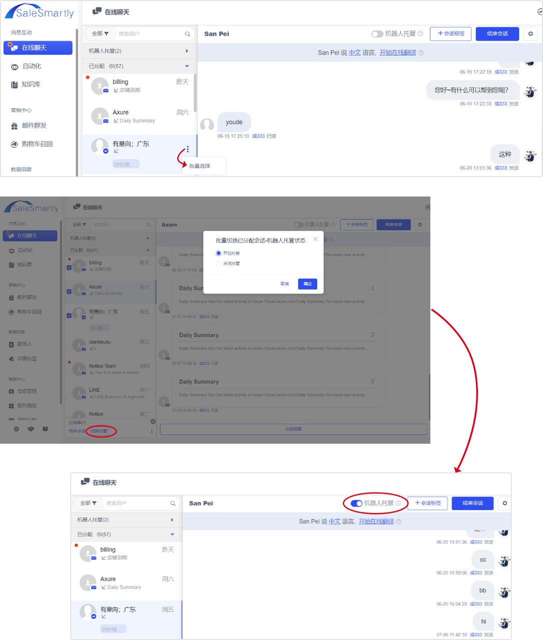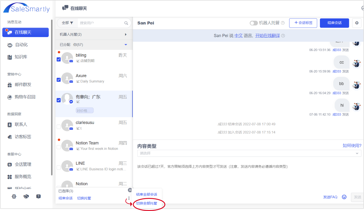 In Online Chat, you can now set the robot hosting status of assigned sessions in batches or all of them. If you want to turn off the robot hosting status in the conversation with certain visitors, you can use this feature.