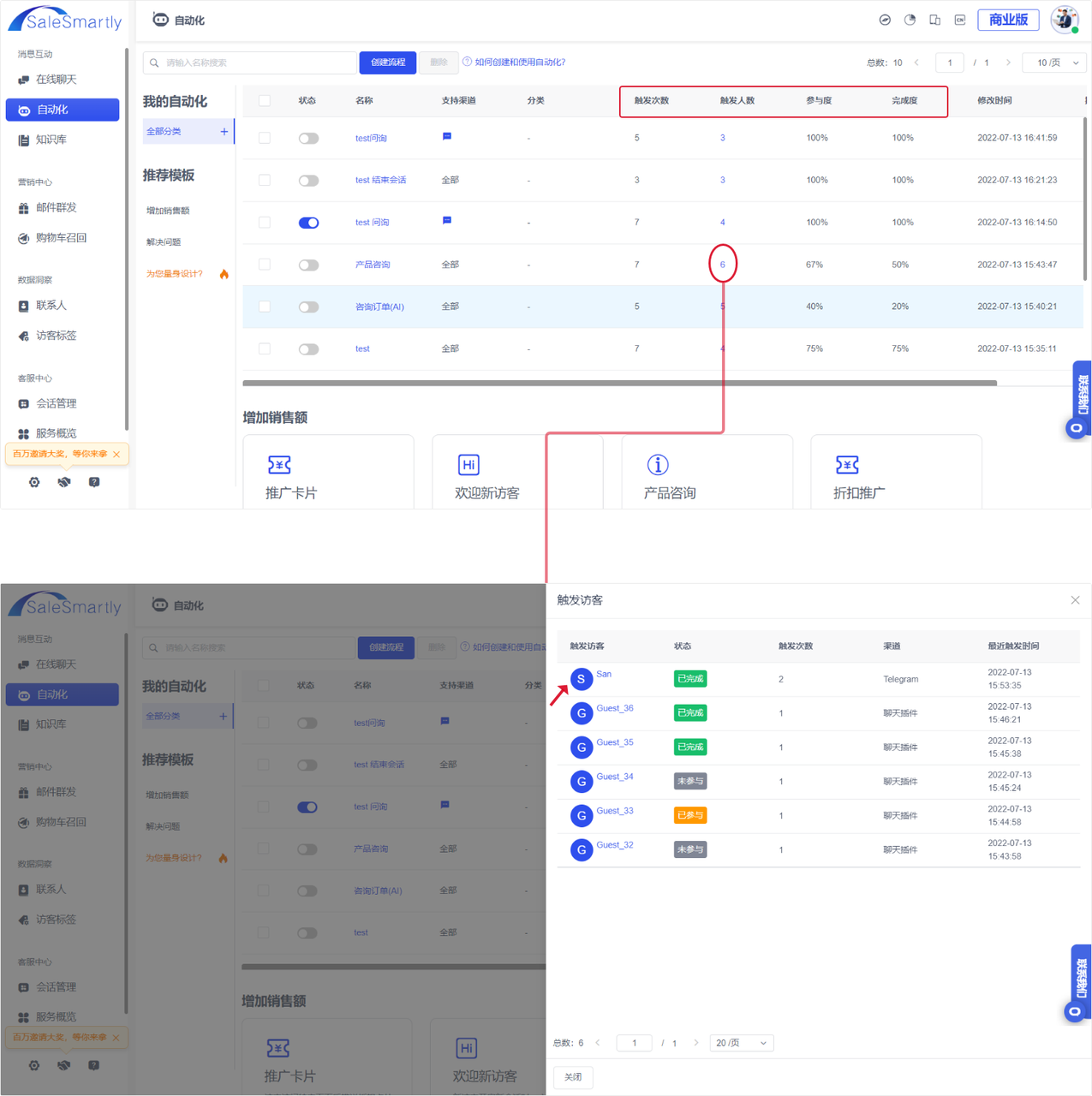 Usage scenarios: You can use automation data to compare and analyze the triggering of automation processes horizontally, so as to optimize the automation processes; you can also view the triggering and participation of visitors in a certain automation process, and take marketing measures accordingly, such as "private chat" and "send promotional emails".