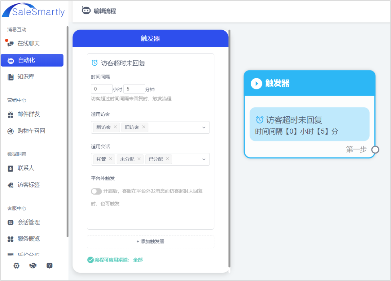 In the Automation module, when setting the trigger Visitor timed out and did not reply, you can now distinguish between "new visitors/old visitors" and select the effective session status such as "hosted session/unassigned session/assigned session". At the same time, you can also set to enable "off-platform triggering". After enabling it, when the customer service replies to the message outside the SaleSmartly platform (i.e. the original social media platform), if the visitor does not reply, the process will also be triggered.