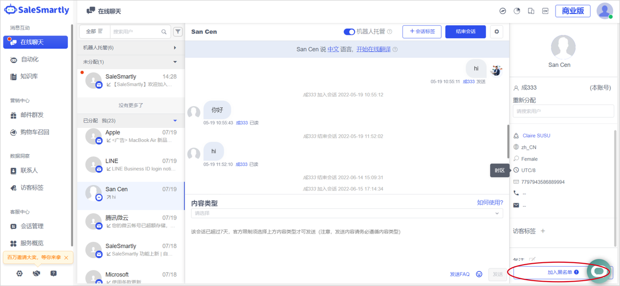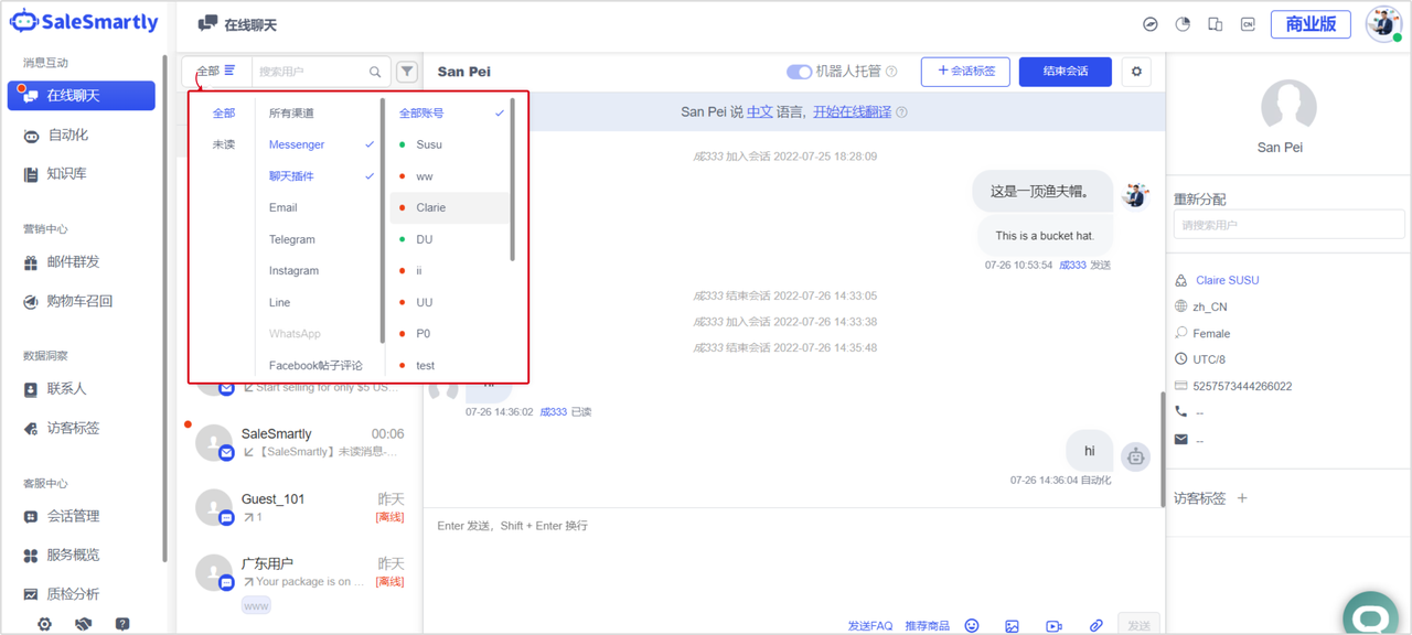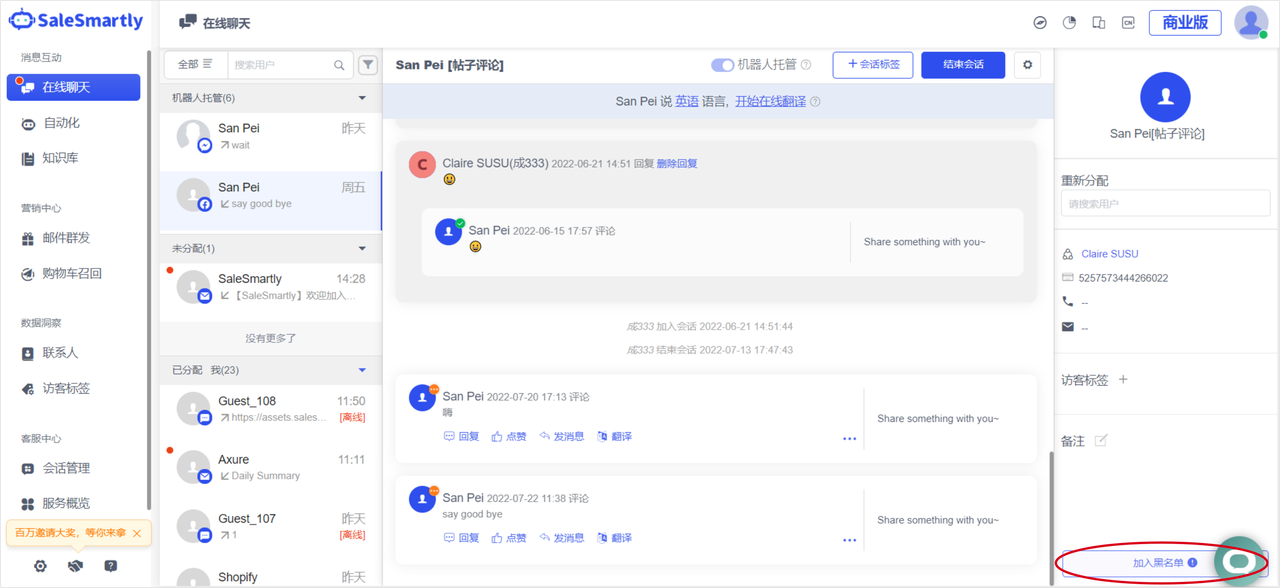 In Live Chat, you can now block visitors from Messenger and Facebook homepage post comments on the SaleSmartly platform. If you block a user from the Messenger channel, the user can continue to send you messages on Messenger, but you will no longer receive their messages on SaleSmartly. After the removal, you will be able to send and receive messages normally; if you block a user from the FB post comment channel, the user can continue to comment on your homepage posts, and Salesmartly can automatically hide every subsequent comment message sent by the user.