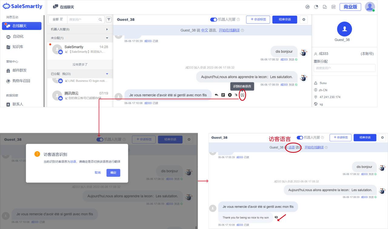 Usage scenario: Can't understand the message sent by the visitor? Don't know what language it is? Directly identify the language of the message sent by the customer, convenient and fast.