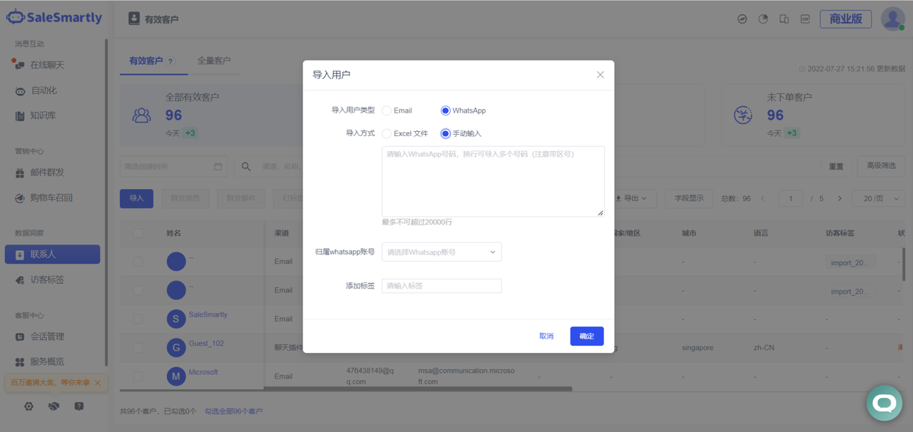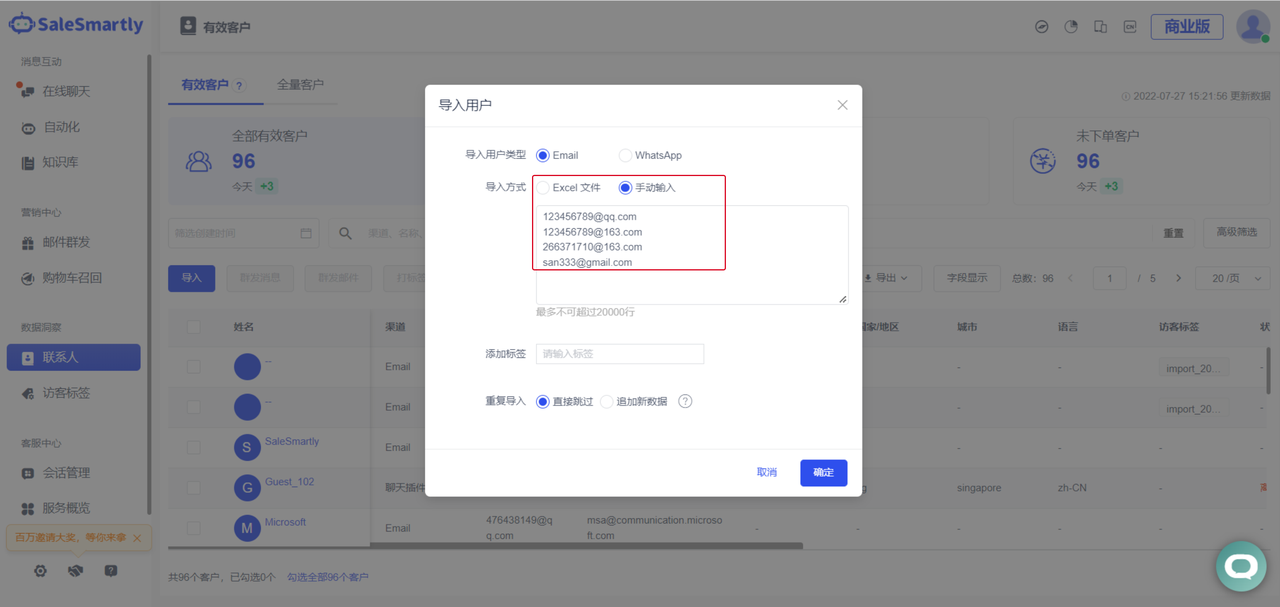 In Contacts, when importing users, you can now manually enter the user's Email and WhatsApp information. One line represents one Email or WhatsApp number, and you can import multiple Emails or WhatsApp numbers by wrapping the line.