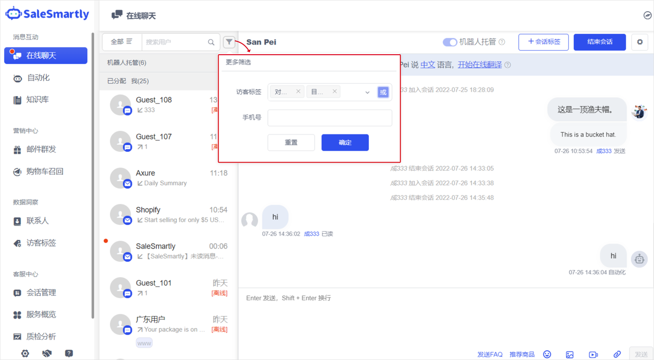 In Online Chat, you can now filter users based on specific accounts under specific channels, as well as based on visitor tags and mobile phone numbers.