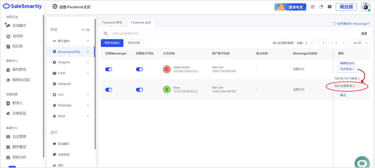 Usage scenario: If you have integrated multiple Facebook homepages in SaleSmartly, and you need to synchronize all the contacts in these homepages, you can click "Sync all contacts" to synchronize them in one click without repeating the operation!