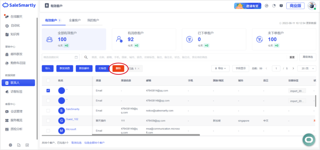 In Contacts, you can now delete contacts. Even if a customer is deleted, their conversation records are still kept in Conversation Management, and you can initiate a chat with them.