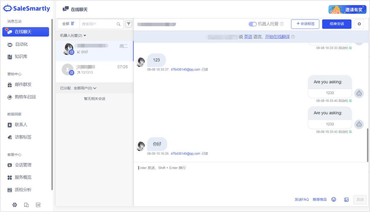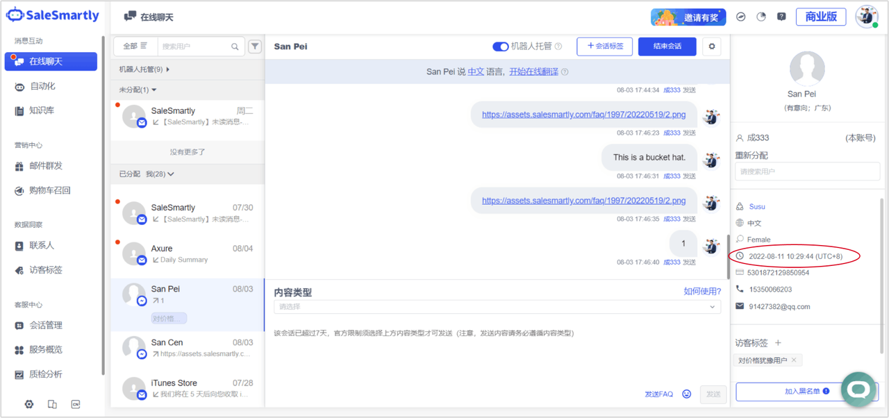 Usage scenario: With this function, you can see the time of the last message in the conversation (including visitor messages or messages sent by customer service, messages sent by humans & robots, and messages sent within or outside the platform).