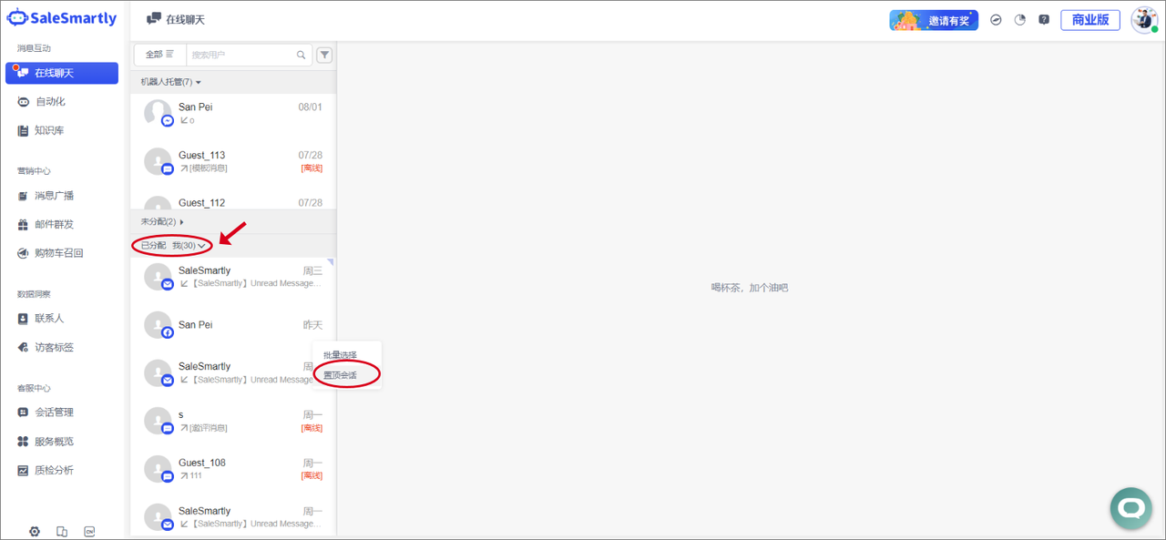 In Online Chat, you can now pin assigned conversations. Bot-hosted and unassigned conversations do not support pinning. Only "assigned" conversations can be pinned, and the pinning operation only appears in the Assigned - My conversation list.