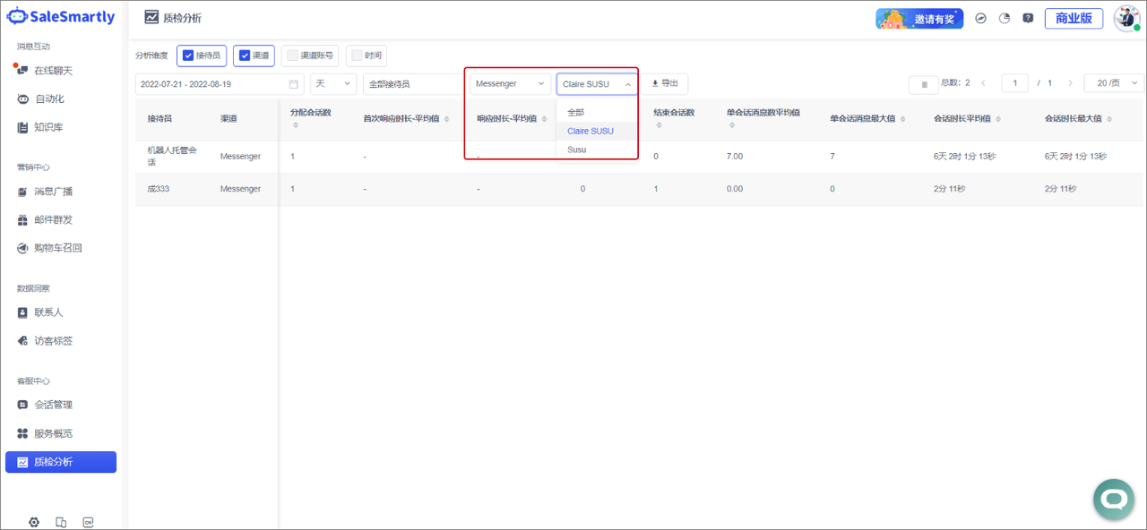 In Customer Service Center - Quality Inspection Analysis, you can now view the quality inspection analysis of accounts under specific channels.