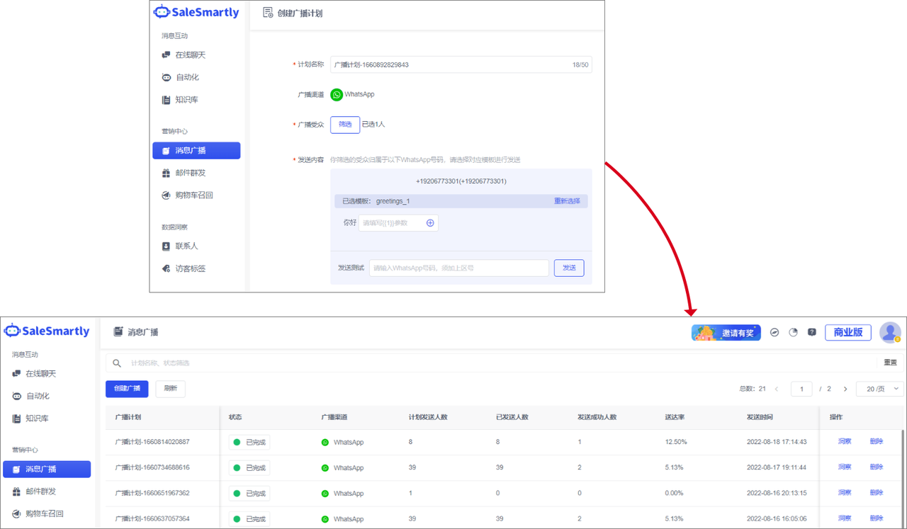 Under the Marketing Center, the Message Broadcast module is now added. In this module, you can send group messages to WhatsApp users, and support sending message templates to customers in the WhatsApp channel whose session time exceeds 24 hours. After sending the message template, you can also view the data related to the number of people who planned to send, the number of people who have sent, the number of people who successfully sent, and the number of people who failed to send, as well as view the planned sending status. If the sending fails, you can also view the reason for the failure.