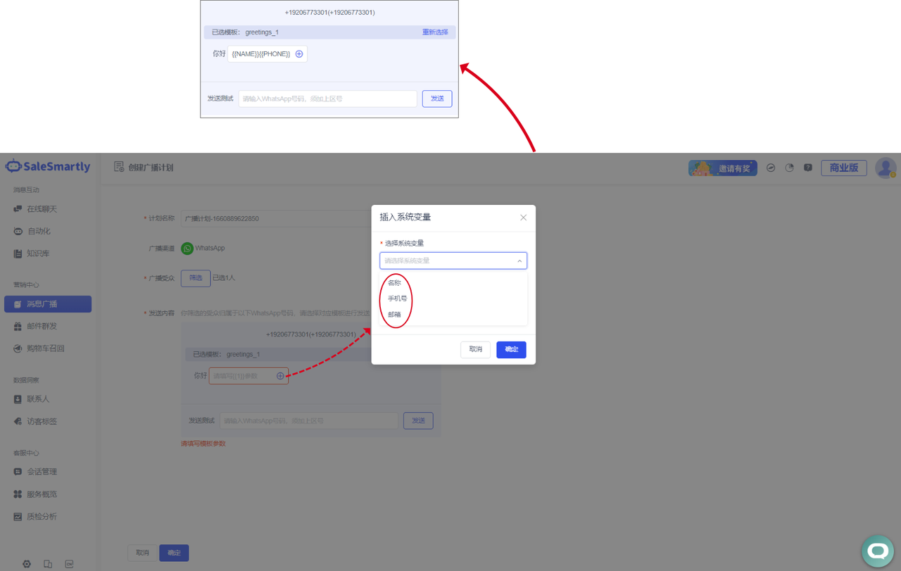 In Marketing Center - Message Broadcast, you can now insert variables such as mobile phone number, email address, nickname, etc. when editing message templates to customize the customer address.