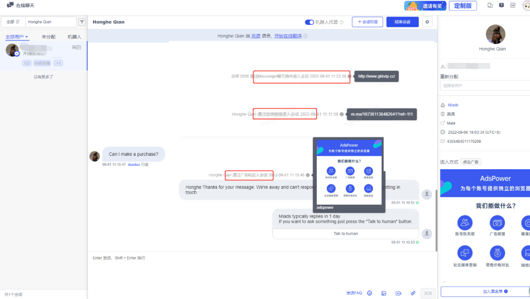 Usage scenario: With this feature, businesses can identify the source channels of Messenger visitors, that is, how the visitors enter and initiate the conversation.