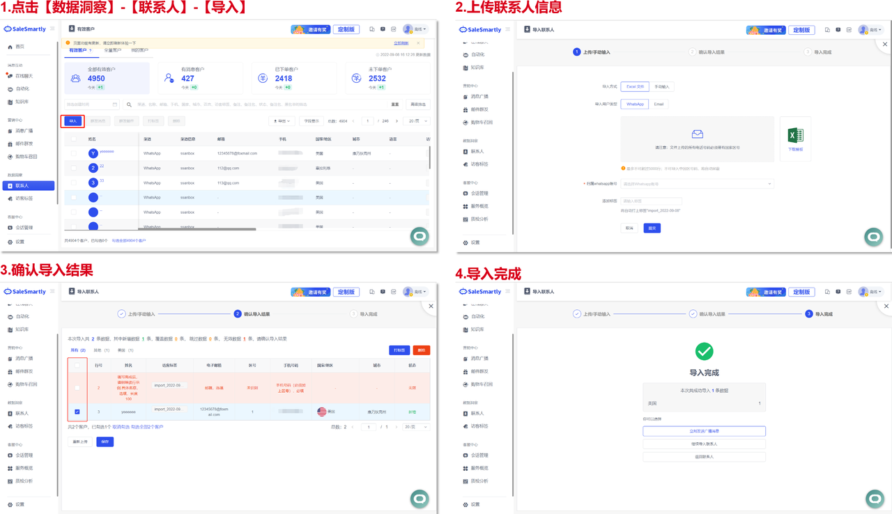 Usage scenario: When importing contacts, merchants can view and confirm the import results, which improves your experience of batch importing WhatsApp number packages and email packages, so that you can send targeted group messages to your target customers.
