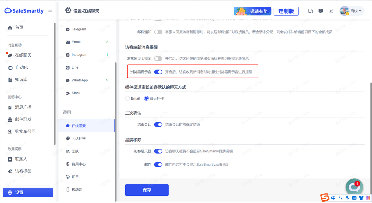 Usage scenario: After this function is turned on, if a visitor receives a new message from the chat plug-in, he or she will be reminded by a browser prompt sound, thereby improving the communication efficiency between the merchant and the visitor.