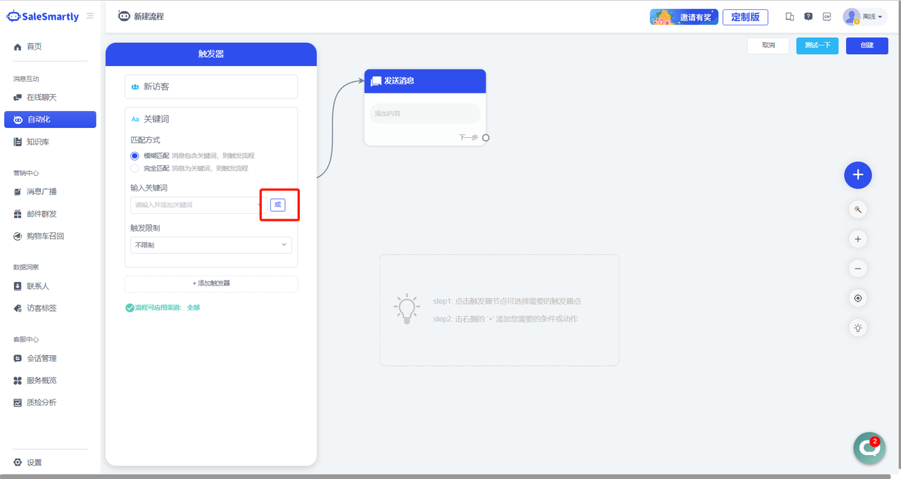 Usage scenario: When the merchant selects this function when hosting the robot, it can help the robot to answer visitor questions more accurately. For example, if you select "product" and "purchase" as keywords, and set the condition "and" for the keywords, when the visitor triggers these two keywords at the same time, such as sending "This product is very good, I want to buy it", the corresponding automation process will be triggered and reply.
