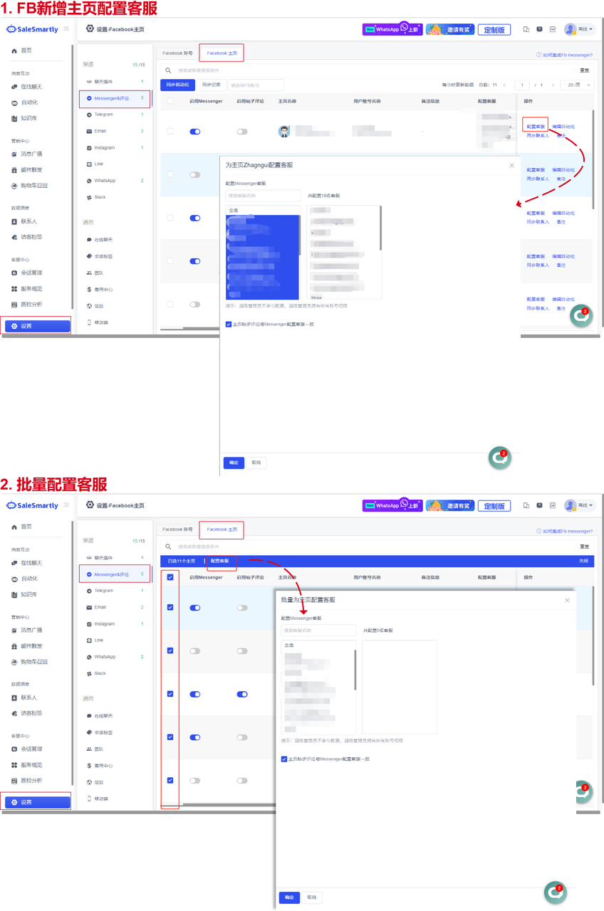 A new customer service configuration function has been added in Settings - Messenger & Comments - FB Home Page, and customer service can also be configured in batches.