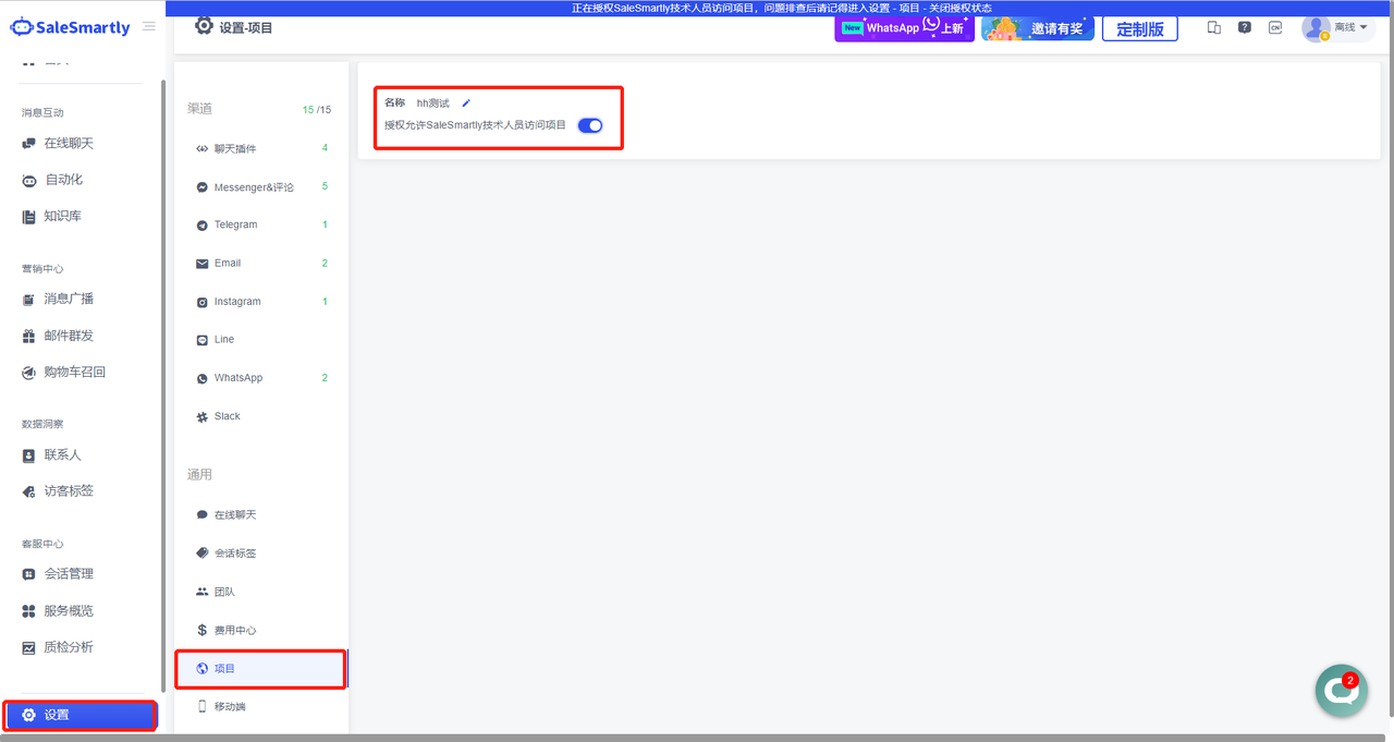 Usage scenario: When merchants encounter problems using the platform and cannot solve them themselves, they can use this function to authorize Salesmartly technicians to access the project to help merchants troubleshoot the problem.