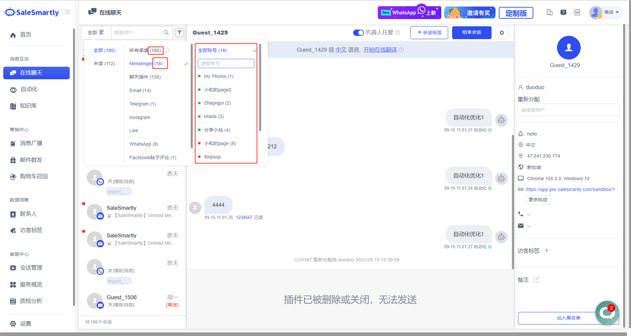 In Online Chat, it is now possible to display the visitor source for visitors from the Messenger channel (Note: there are three main visitor sources, namely advertisements, messenger links, and Messenger chat plug-ins).