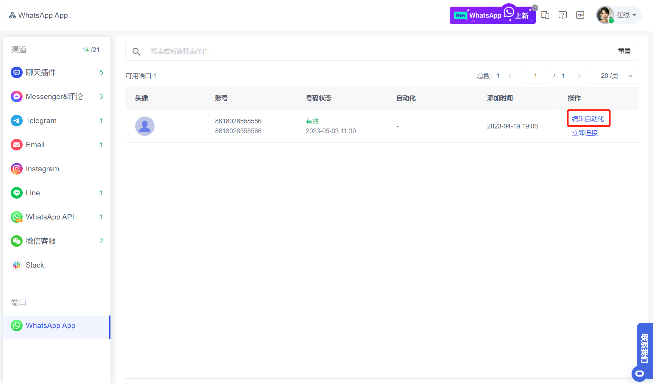 Usage scenario: It is convenient for merchants to quickly experience the functions of the WhatsApp App channel. They can activate WhatsApp devices by themselves and experience it immediately without contacting manual customer service.