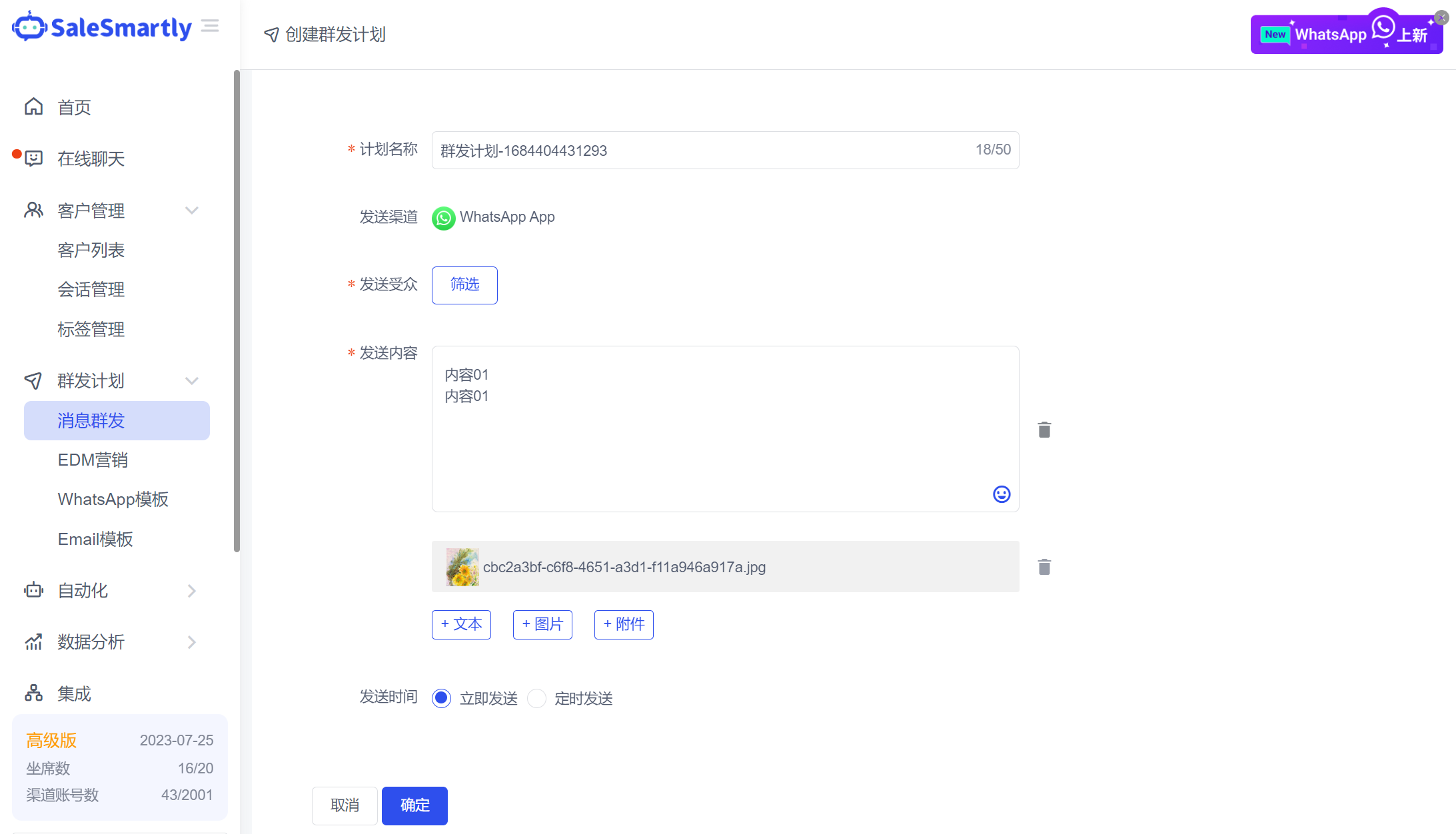 In Mass Message Plan - Mass Message, you can create a mass message plan based on a WhatsApp account; the mass message audience type can be selected as contacts, groups/communities, and batch mass messages can be sent.