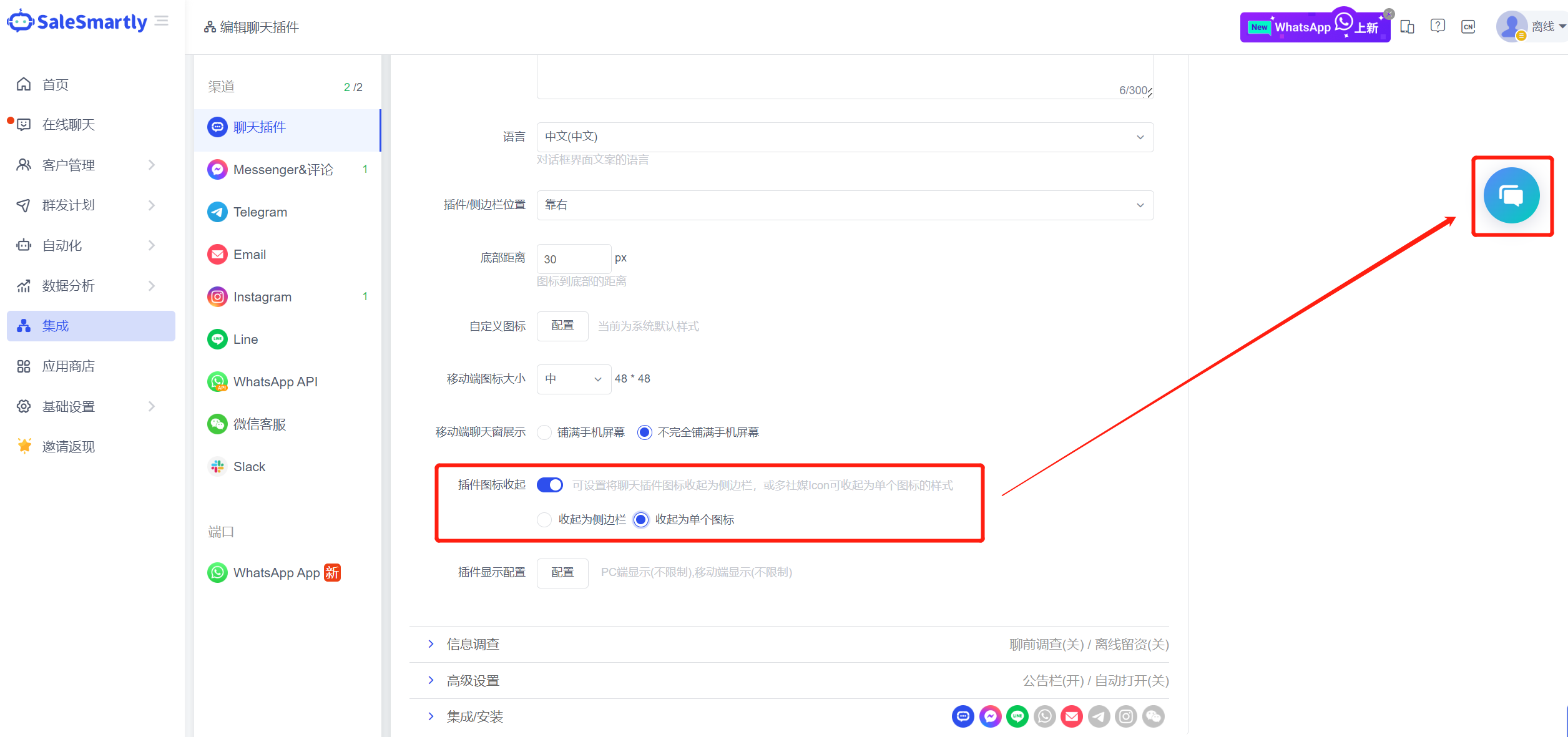 Usage scenario: If your chat plug-in has multiple social media traffic icons enabled, you can collapse them into a single icon to avoid your website having too many traffic icons and affecting the visitor's browsing experience.
