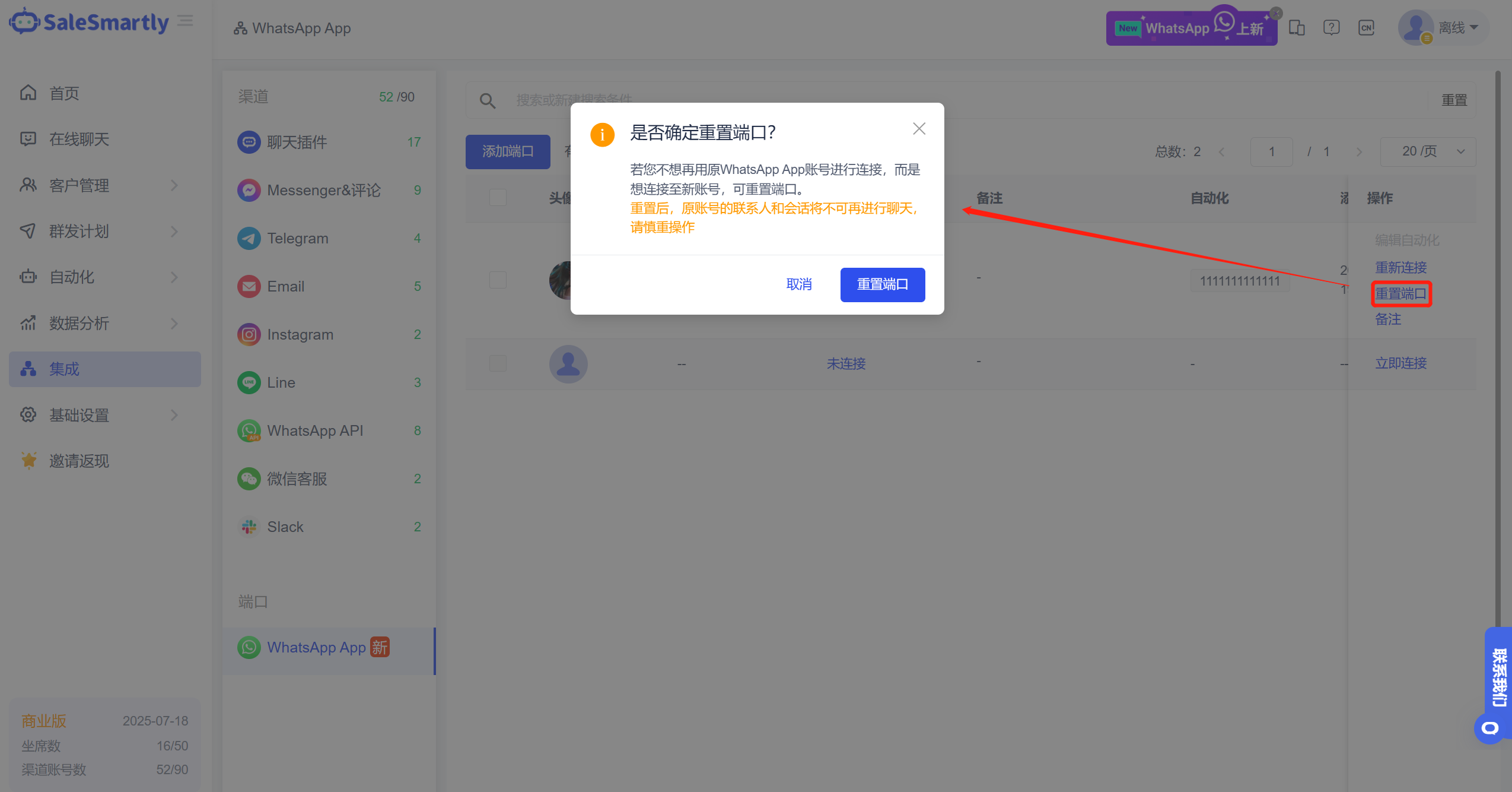 In the Integration-WhatsApp App list, you can reset the device for an expired account.