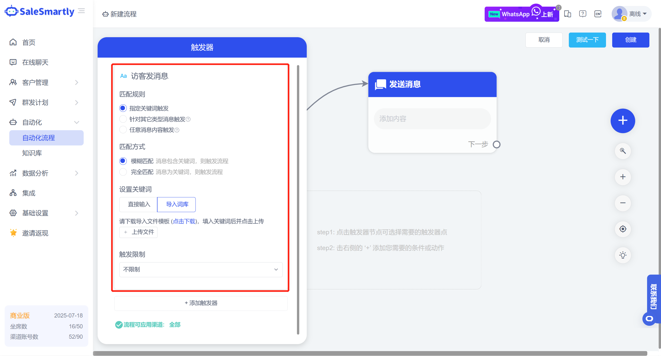 Usage scenario: Implement the robot automated reception function for WhatsApp accounts. It can automatically execute the sending script through triggers such as new visitors, keywords, timeouts, etc., to improve visitor reception efficiency.