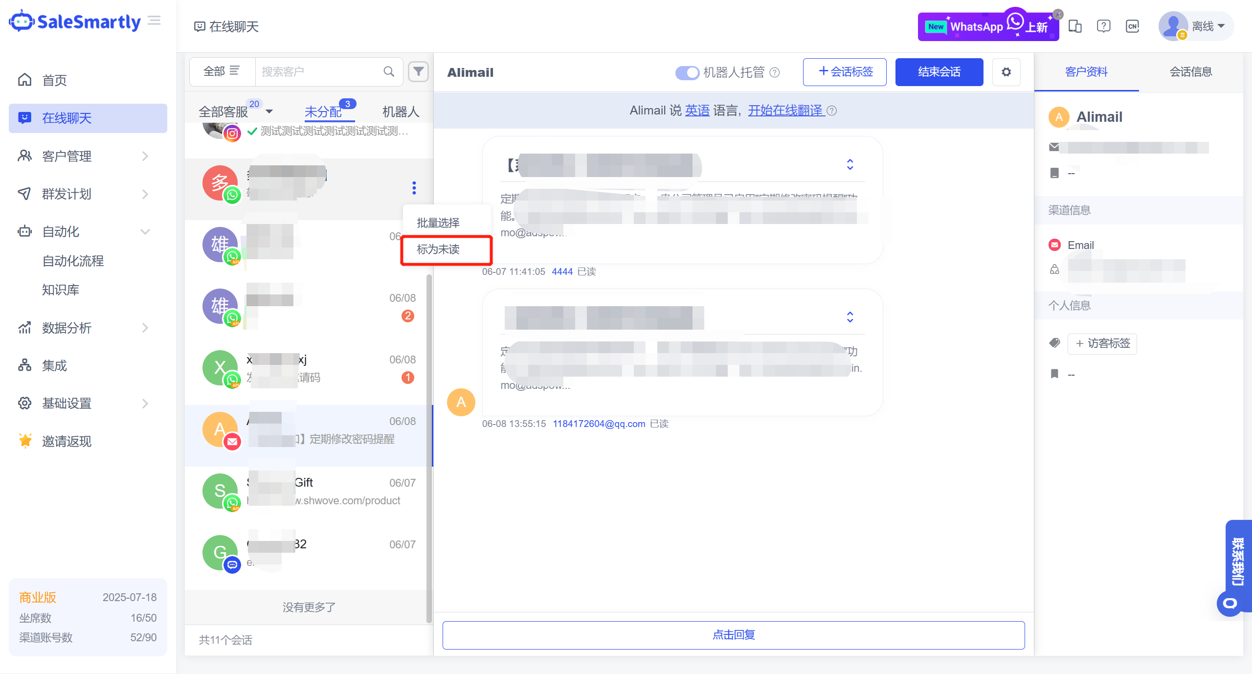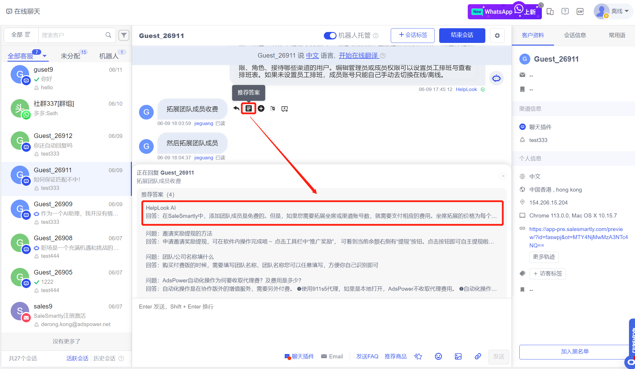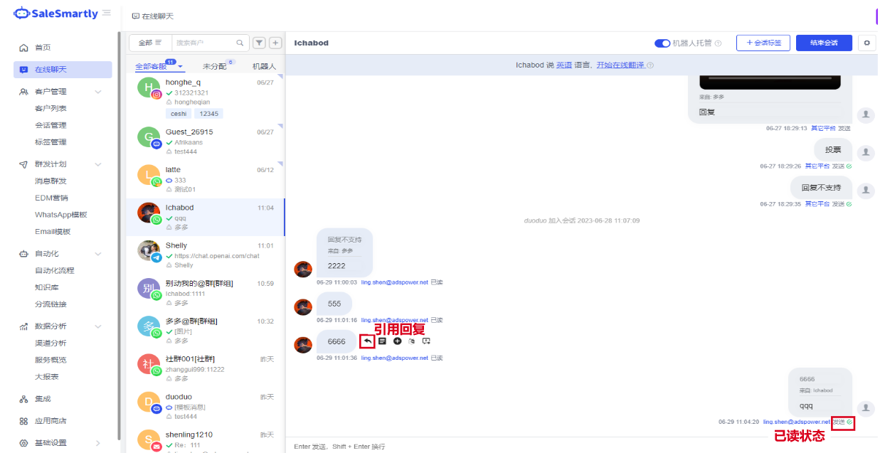 In the Online Chat template, a new message read function has been added for WhatsApp accounts. After the customer service sends a message, you can see whether the other party has read the message. At the same time, it supports quoted replies to the above chat message.
