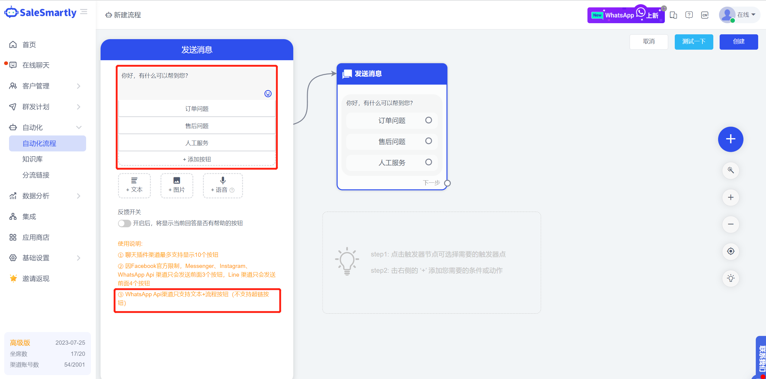 Usage scenario: After a visitor triggers the automation, your WhatsApp API number can send a message template with a button to the visitor for free, and after the visitor clicks the button, the corresponding branch of the content can be automatically sent. At this point, you can configure a refined self-service consultation process for the WhatsApp API number.
