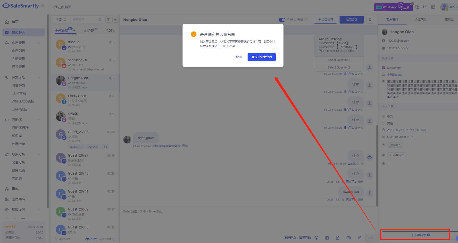 In the conversation interface of the Online Chat Facebook comments and Messenger channels, you can add users to the blacklist with one click.