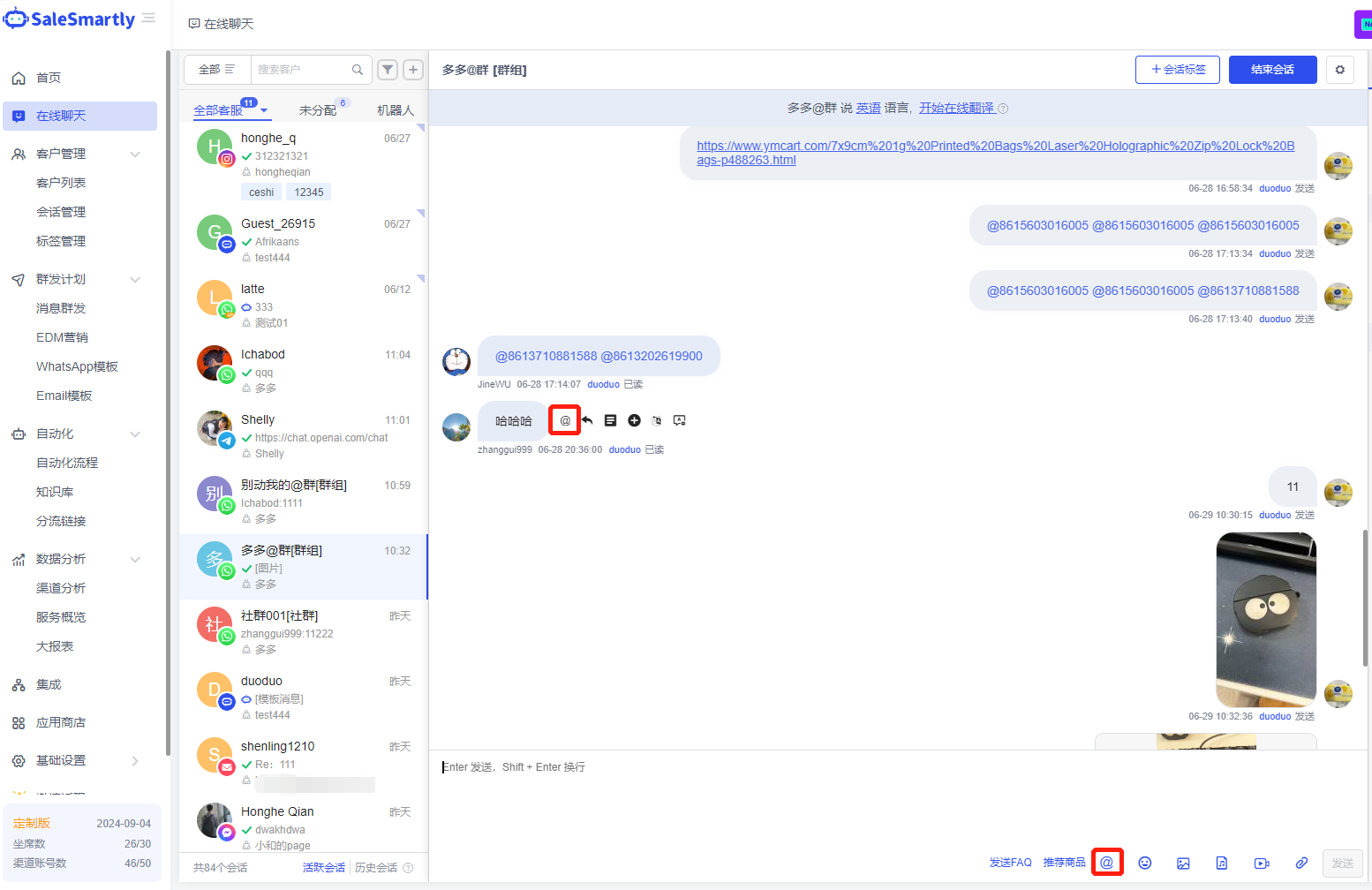 Usage scenario: Customer service can tag members in the WhatsApp group to make their reply messages more targeted and remind corresponding members.