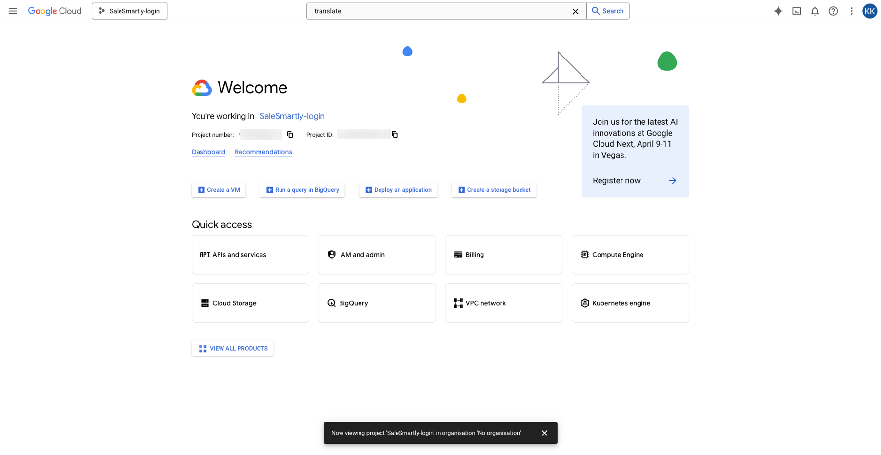 Click Select Project to create a new Translate API project, create the project. Then click Continue.