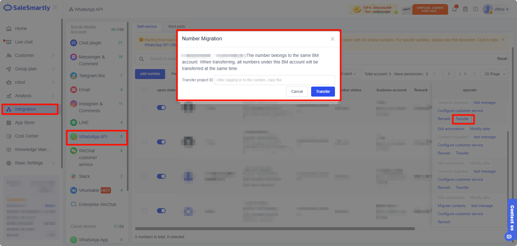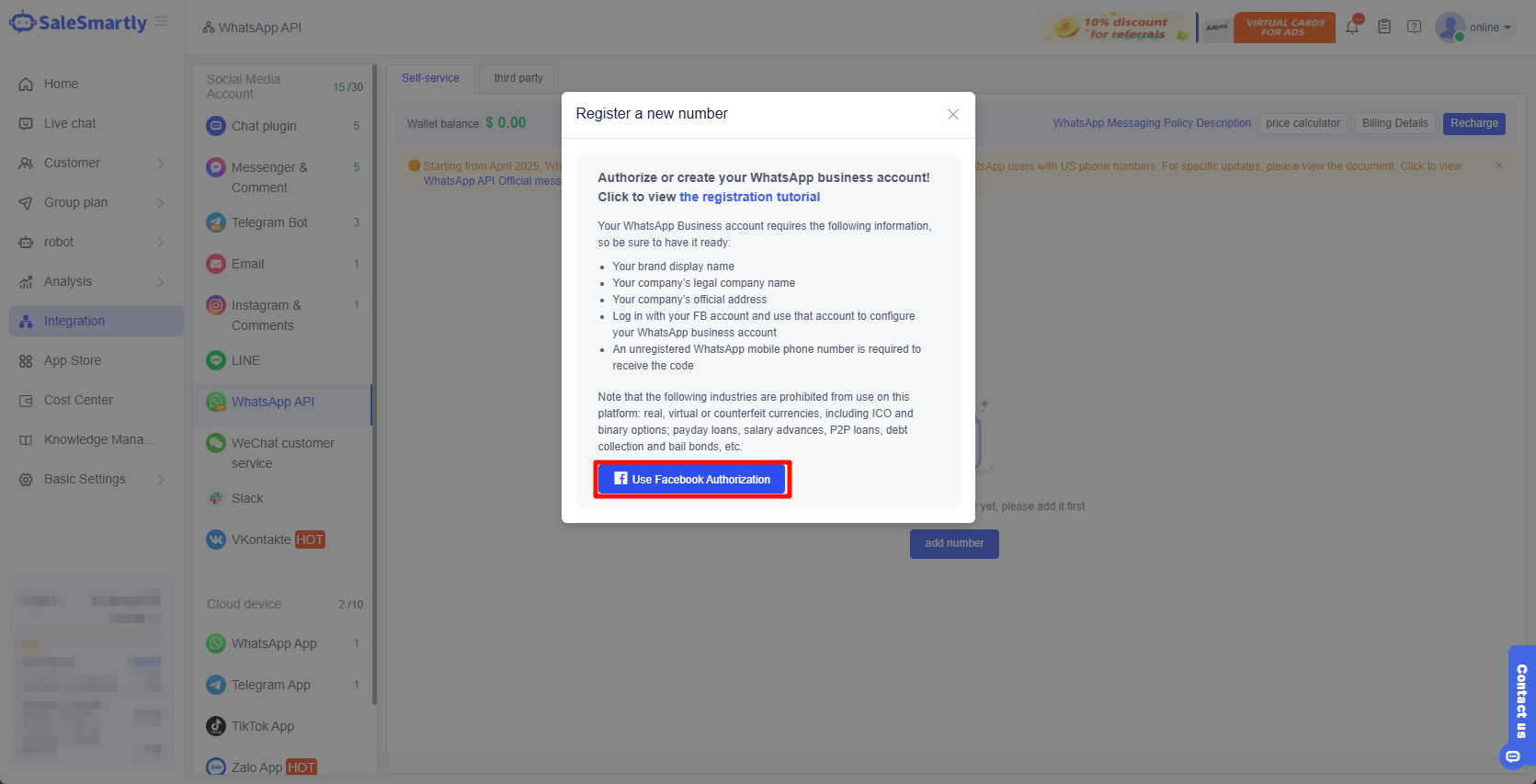 2.1. Go to Integration - WhatsApp API - Self-service - Self-service registration