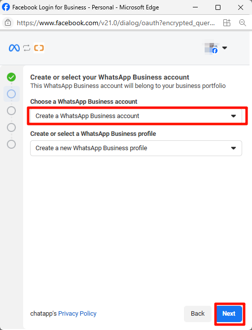 - Log in with your FB account and use that account to configure your WhatsApp business account