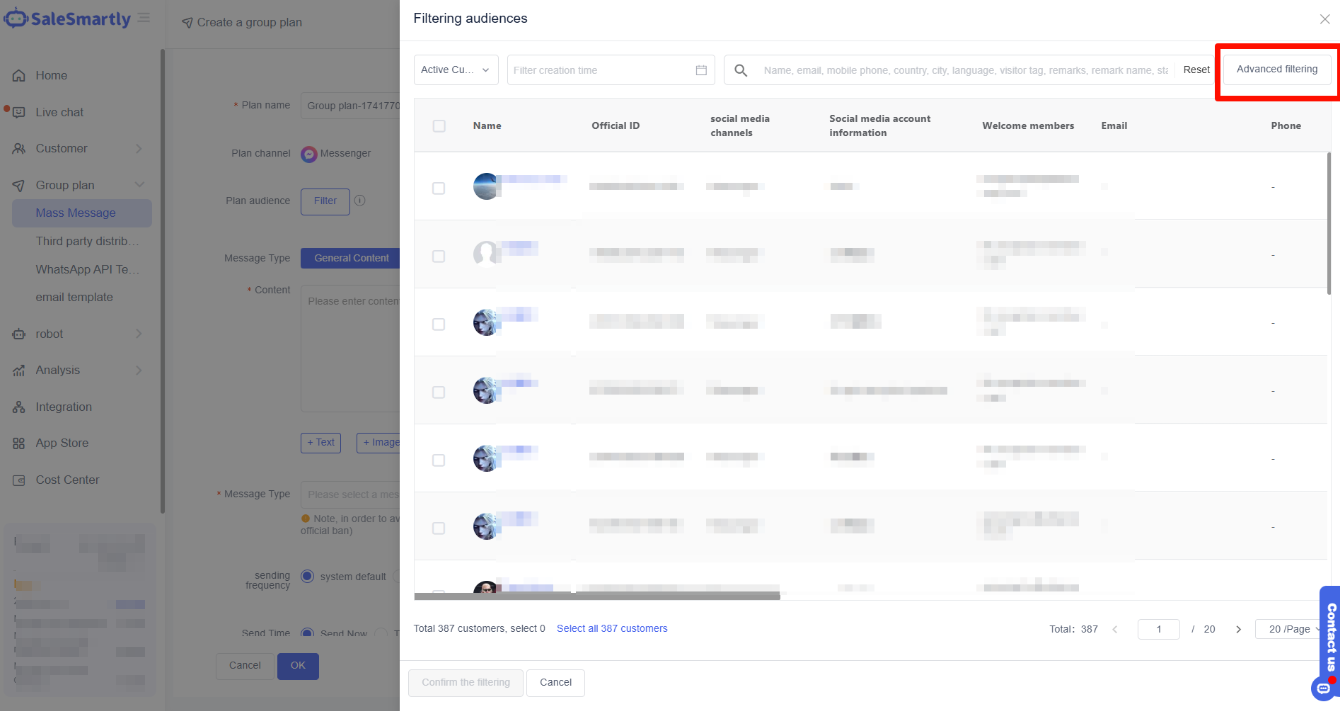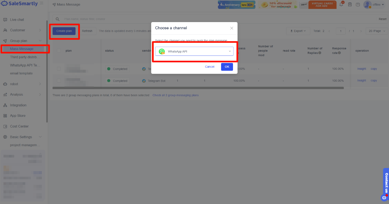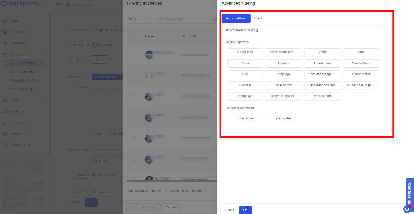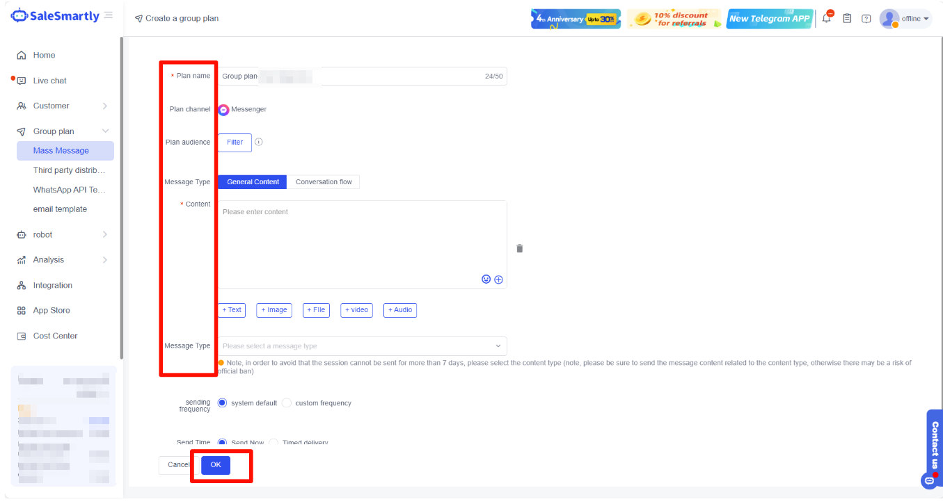 After editing, click OK to execute the mass messaging plan. For detailed settings, please go to the introduction to mass messaging settings